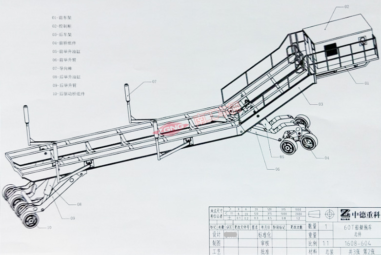 1、拖车承载拖行能力为60吨,平台主框架采用30号型钢,主梁四条50号高锰合金型钢,最大宽度4米,长度为19.8米,为方便运输整车设计为组件拼装式,顶前部为电控箱、电池及液压系统。底前部为转向机构控制系统。底部为两套升降拖船支撑平行调整机构。两侧各设计两套可调视宽导向棒。