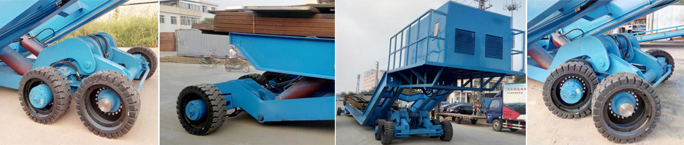 5、为满足低水位船艇试水要求,拖车后部设计高度可调升降机构,调节范围1-3.8米。为满足坡度行驶安全稳定前部均设计平衡调节机构。确保在不同坡度行走时船艇均保持水平状态,大大提高行驶安全。